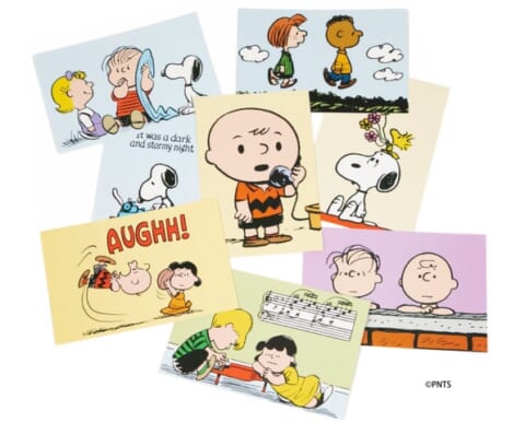 「エッセンシャル・ピーナッツ75選」編集委員会メンバー選りすぐりの本書収録作品から、さらに厳選されたカットをあしらったポストカードが8枚封入されます。