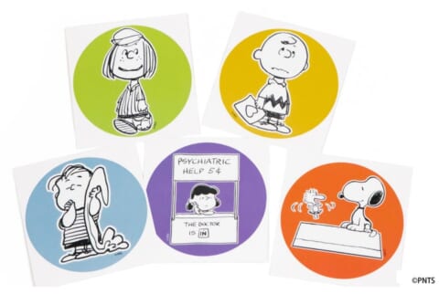 犬小屋の三角屋根で語らうスヌーピーとウッドストック、ルーシーの精神科スタンド、青い「安心」毛布とライナス、運動神経バツグンのペパーミントパティ、そして、「赤毛の女の子」に恋する「おなじみいいやつ」チャーリー・ブラウン。これら『ピーナッツ』を代表するキャラクターたちのステッカー5枚が付属します。