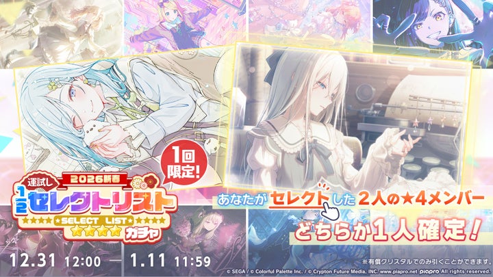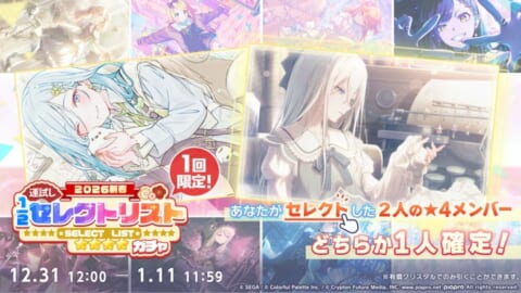 「[2026新春]運試し1/2セレクトリストガチャ」では、ユーザーが選んだ2人の★4メンバーのうち、いずれか1人を確定で獲得できる特別な機会を提供します。また、2026年1月1日(木)18:00からはプロセカ公式YouTubeチャンネルにて、松丸亮吾さん率いるRIDDLERによる『プロジェクトセカイ』の謎解きに豪華キャストが挑戦する「新春! プロセカ謎解きバトル」が配信されます。