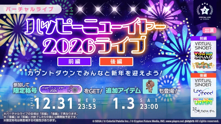 2025年12月31日(水)からはバーチャルライブの待合エリアに「セカイ神社」が登場し、おみくじや限定アイテムの購入を楽しめます。同日には「ハッピーニューイヤー2026ライブ」が開催され、参加者には限定称号「カウントダウン2026」やアバターアイテムをプレゼントします。さらに、「2026新春初売りクリスタルショップ」ではお得なクリスタルや福袋が販売され、プロセカ公式ストア限定の「新春デラックスセット」も登場します。