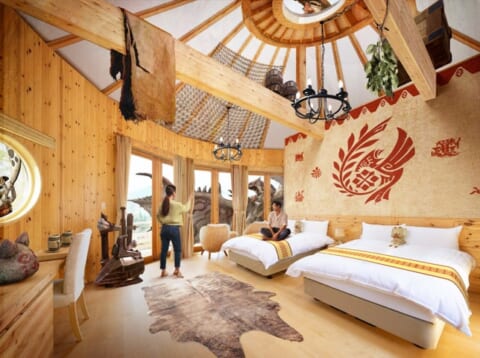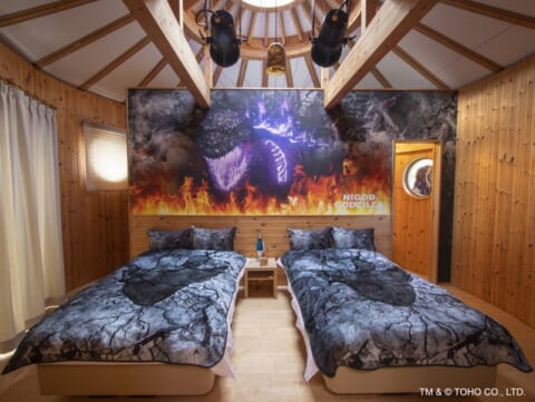 ニジゲンノモリ内のグランピング施設「GRAND CHARIOT 北斗七星135°」では、ゴジラとモンスターハンターの世界観を楽しめるコラボルームと、淡路島の食材を活かした食事が提供されています。