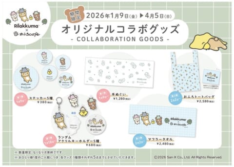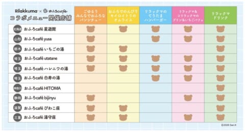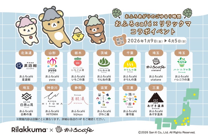 サンエックス株式会社と株式会社温泉道場は、リラックマとおふろcaféのコラボイベント「おふろあがりのごゆるりタイム2026」を2026年1月9日より全国13店舗で開催します。