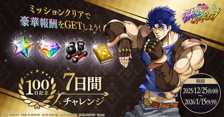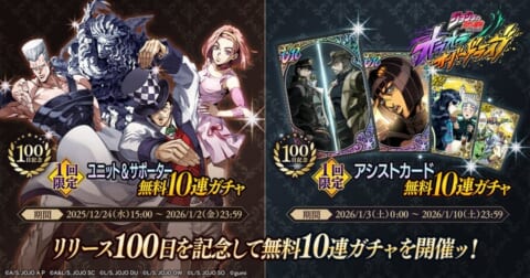 アプリゲーム『ジョジョの奇妙な冒険 オラオラオーバードライブ』では、リリース100日を記念し、無料10連ガチャ7日間チャレンジを含むキャンペーンを2025年12月24日より開催します。開催内容や参加方法を詳しく紹介するのでぜひ参考にしてください。