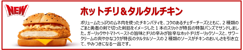 同じく新登場の「ホットチリ&タルタルチキン」は、ボリューミーなチキンパティに、旨辛なホットチリガーリックソースと、サワークリームの爽やかなコクが特長のタルタルソースの2種類で味を引き立てる一品です。