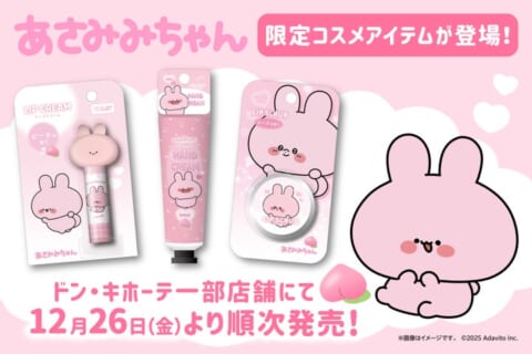 2025年12月26日(金)より、ドン・キホーテの一部店舗で『あさみみちゃん』限定描き下ろしイラストを使用したコスメ雑貨が登場します。ピーチの香りを基調としたリップクリーム、ハンドクリーム、リップスクラブの3アイテムがラインナップします。