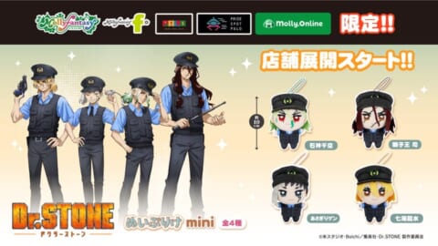 モーリーオンラインスクラッチで好評だったTVアニメ『Dr.STONE』の描きおろし衣装が、「ぬいぷりけmini」として新たに登場します。石神千空、あさぎりゲン、七海龍水、獅子王司の4人が、警察官衣装に身を包んだデフォルメデザインでラインナップ。