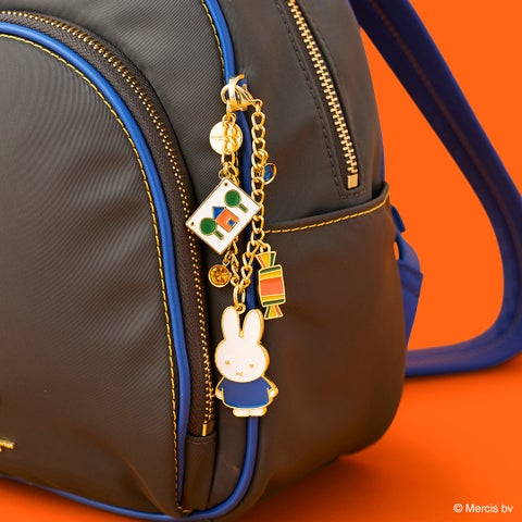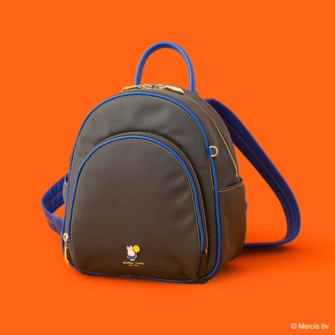 グレーをベースにブルーナブルーを配色したデザインのリュックです。フロントにはイエローの風船を持ったミッフィーのイラスト金具を合わせ、チャームやパスケースを取り付けられる金具も備えています。