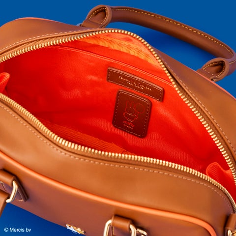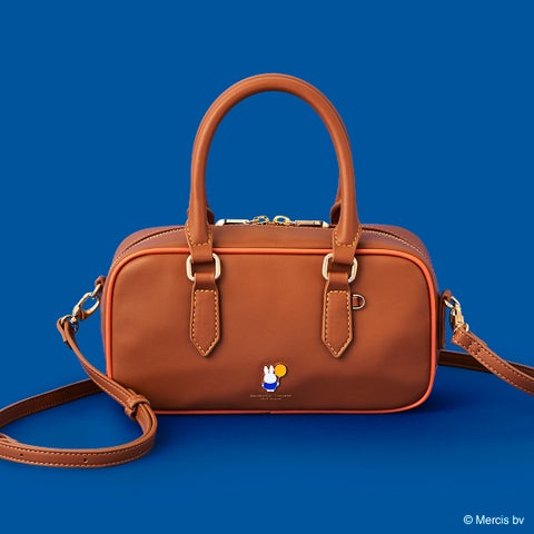 ボストン型のショルダーバッグは、ブラウンをベースにブルーナレッドがさりげなく入ったデザインが特徴です。フロントには小物シリーズと共通の、イエローの風船を持ったミッフィーのイラスト金具が可愛らしさを添えます。