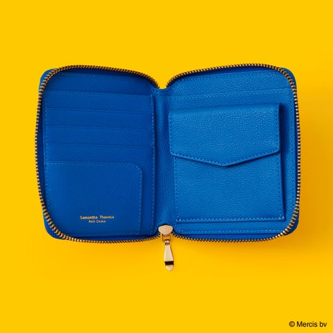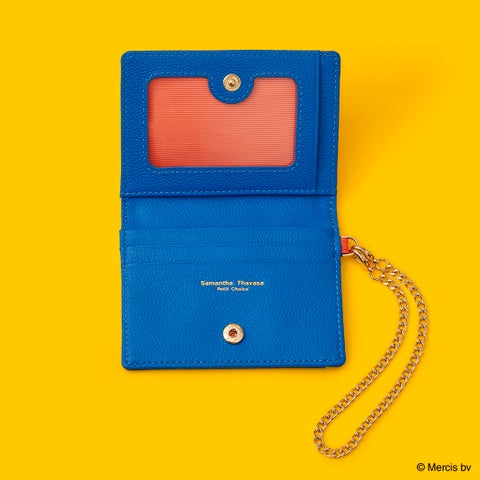 内装はブルーナブルー、裏地にはブルーナレッドを使用。カードを4枚収納でき、スナップボタン付きの小銭入れを備えた機能的なデザインです。