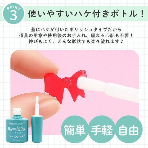 レジン作品や紙、写真、フィルムなど、あらゆる素材の裏面に塗布して乾かすだけで、「貼って剥がせるシール」に加工できます。塗布時は白色ですが、乾燥すると透明になるため、作品のデザインを損なう心配がありません。SNSで話題のぷっくりシールをレジンで再現する際にも活用できます。