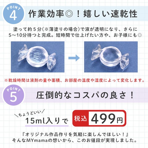 たっぷり15ml入りで税込499円という価格設定です。伸びが良い特性を持つため、少量で広範囲に塗布でき、長く使える点が魅力です。オリジナル作品づくりを気軽に楽しめる価格帯で提供します。