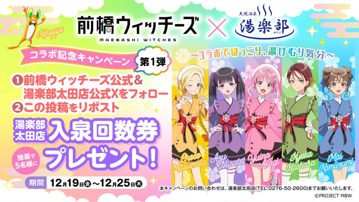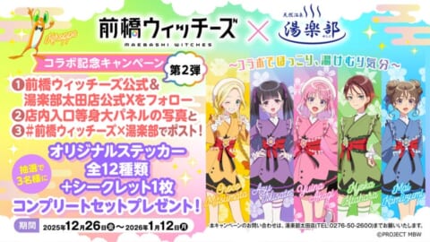 TVアニメ『前橋ウィッチーズ』と天然温泉 湯楽部 太田店とのコラボレーションが決定しました。限定グッズやコラボメニューの提供、等身大パネルの設置など、作品の世界観を楽しめる企画を展開します。