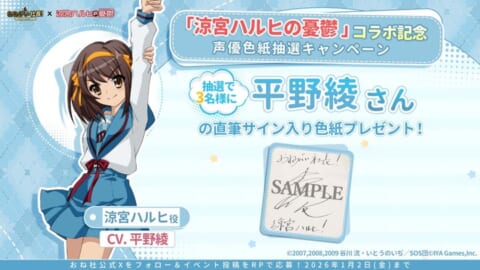 涼宮ハルヒ役の平野綾さん、朝比奈みくる役の後藤邑子さん、長門有希役の茅原実里さんのサイン入り色紙をプレゼントします。