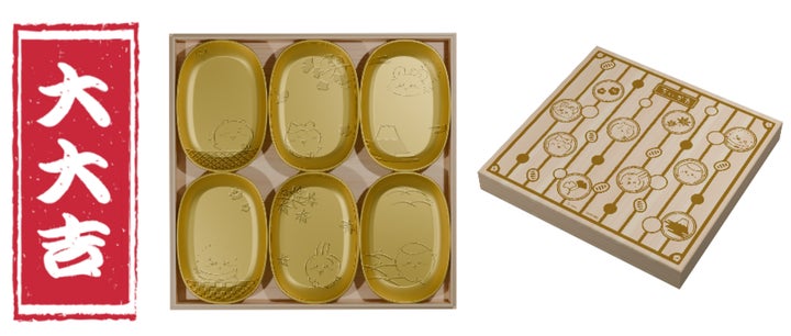 抽選で100名様に、ここでしか手に入らないオリジナルデザインの「ちいかわ小判風豆皿セット(木箱入り)」が当たります。金色の華やかなデザインがお正月にぴったりです。
