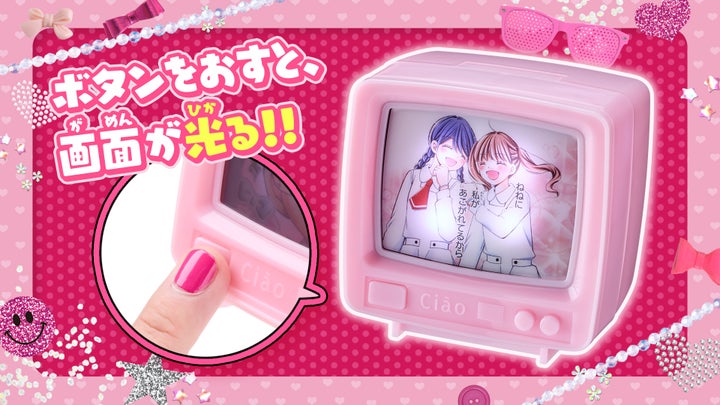 また、『僕は人魚姫を食べたい』『ねこ、はじめました』『溺愛ロワイヤル』『1秒先は、恋』『シャイニング!』といった「ちゃお」の人気漫画の名場面カードが5枚付属します。これらのカードは気分に合わせてテレビ画面にセットし、シーンを切り替えて楽しむことが可能です。さらに、運気アップのおまじないも付いています。