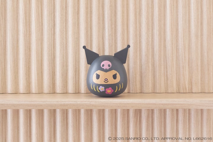 クロミの黒ずきんとピンクのドクロが再現された、温かみのある木製だるまです。可愛らしさ満点で、インテリアとしても存在感を発揮するデザインです。クロミの特徴的なお耳も可愛らしく表現されています。黒色のだるまは「金運(黒字)」を招くといわれています。本製品は大人向け雑貨です。