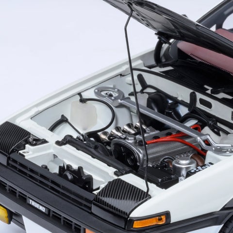 本ミニカーは、『頭文字D』の連載開始30周年を記念し製作されたアニバーサリーモデルです。作中後半の“プロジェクトD”仕様をベースに、フルチューンされたAE86の最終形を1/18スケールで立体化しました。
