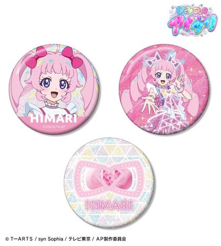 青空 ひまり、星川 みつき、鈴風 つむぎ、一条寺 サクラ、二階堂 タマキ、三ツ葉 アイリ、四之宮 リンリン、真実夜 チィのイラストと、アイプリブレスのデザインをグリッター加工を施した缶バッジ3個セットに仕上げました。カバンや小物につけたり、お部屋に並べて飾ったりして、キャラクターとの日常をお楽しみいただけます。