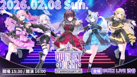 2026年2月8日、東京・BUZZ LIVE 渋谷にて開催する「クインテ 1st Anniversary Live 『Quintet Queen』」は、グループ結成1周年を記念する特別なライブです。このライブの最大の魅力は、メンバーがバーチャルの姿を飛び出し、「リアルの姿」でステージに立ち、歌い踊るパフォーマンスを披露する点です。さらに、画面越しではない直接的なファンとの対面機会も設けており、VTuberの枠を超えた体験を提供します。