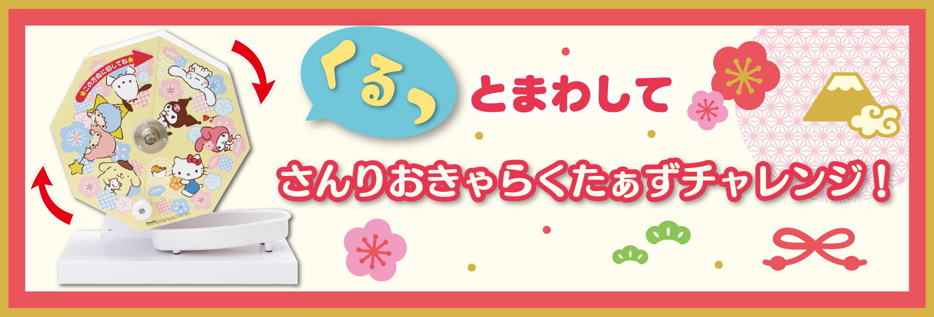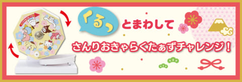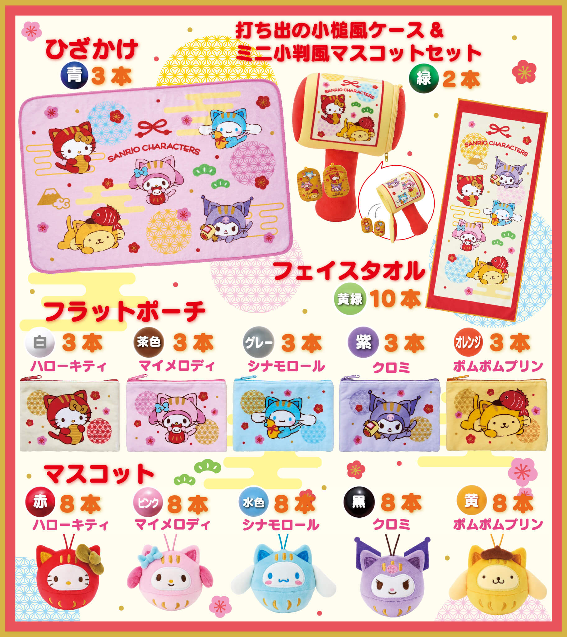 各店の初売りから、サンリオ直営店・百貨店のサンリオコーナーにて「くるっとまわして さんりおきゃらくたぁずチャレンジ!」を実施します。1回990円(税込み)で、出てきた玉の色に応じた賞品を獲得できます。ひざかけ、打ち出の小槌風ケース&ミニ小判風マスコットセット、フェイスタオルなどがラインナップされています。