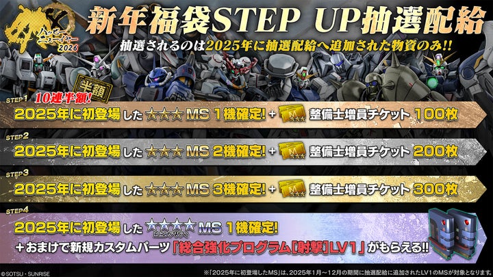 「新年福袋STEP UP抽選配給」では、STEP4で2025年に初登場した★4以上MSのLV1が1機確定で入手でき、さらに新規カスタムパーツ「総合強化プログラム[射撃] LV1」がおまけとして獲得できます。