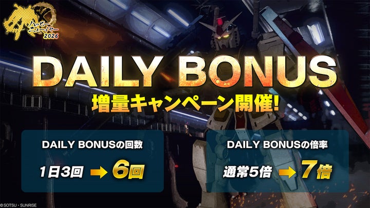 期間中、「デイリーボーナス増量キャンペーン」を実施します。基本報酬が増加するデイリーボーナスの倍率が5倍から7倍に、デイリーボーナスの回数が1日3回から6回に増加します。
