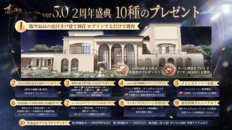 恋愛シミュレーションゲーム『恋と深空』は、2025年12月31日よりVer5.0「2周年盛典」を実装し、イベント「愛、宇宙、詩の王座」の開催や40連無料ガチャを含む豪華特典を提供します。