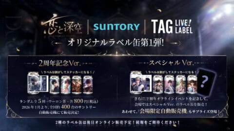 2026年1月より、全国約400台のサントリー自動販売機にて、オリジナルラベル缶が販売されます。2周年オフラインイベント会場には「会場限定自動販売機」がサプライズ登場する予定です。2種類のラベル缶はいずれも後日オンライン購入に対応予定であり、2月には第2弾もお届けされます。詳細は続報にて順次公開されます。