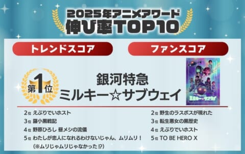 アニメデータインサイトラボは、2025年のアニメ作品を対象とした「2025年アニメアワード」を発表しました。Google検索量とX(旧Twitter)投稿量に基づくトレンドスコアとファンスコアから、年間グランプリとダークホース賞を決定しています。