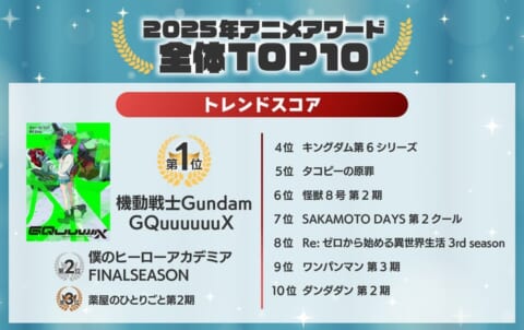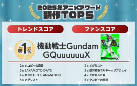 2025年アニメアワードの年間グランプリは、『機動戦士Gundam GQuuuuuuX』がトレンドスコア・ファンスコアの両部門で、新作および全体の全カテゴリーにおいて1位を獲得しました。