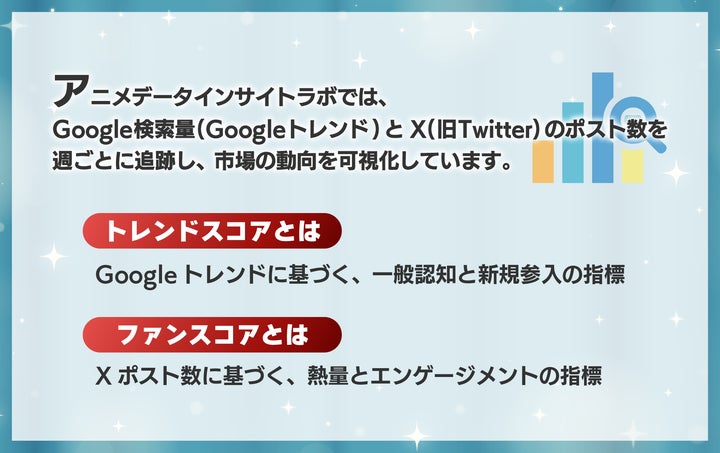 放送期間中のトレンドスコア(Google検索量から算出される一般認知度)とファンスコア(X投稿量から算出されるファンの熱量)の最高値を競います。 |