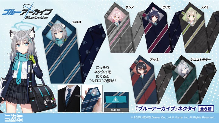 シロコやホシノなど6種類のキャラクターデザインを裏面に忍ばせたネクタイです。価格は各6,050円(税込)。大剣幅7cm、小剣幅4cm、全長145cmのMADE IN JAPAN品質の一品です。