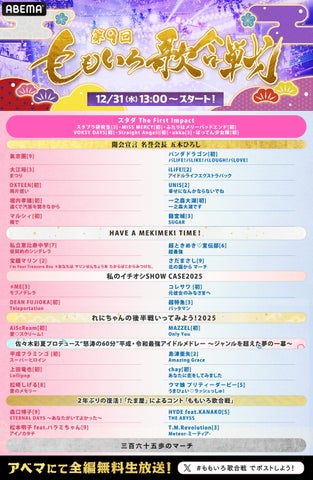 新しい未来のテレビ「ABEMA」は、2025年12月31日(水)に『第9回 ももいろ歌合戦』を日本武道館から全編無料生放送します。