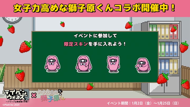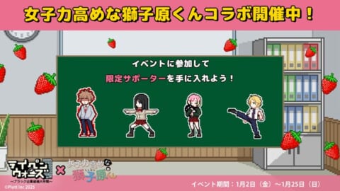 イベント期間中は特別なイベントステージが解放されます。プロジェクトリーダーとして立ちはだかる獅子原くんの体力を削り切ることでステージクリアとなり、イベントアイテム「いちご」を獲得できます。