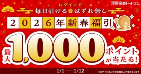 漫画全巻ドットコムは、2026年1月1日より「新春福引き」を開催しています。ログインするだけで毎日挑戦でき、最大1,000ポイントなどが当たるハズレなしのキャンペーンです。