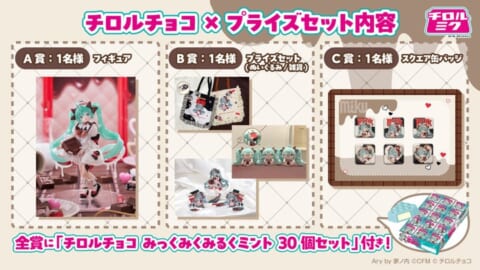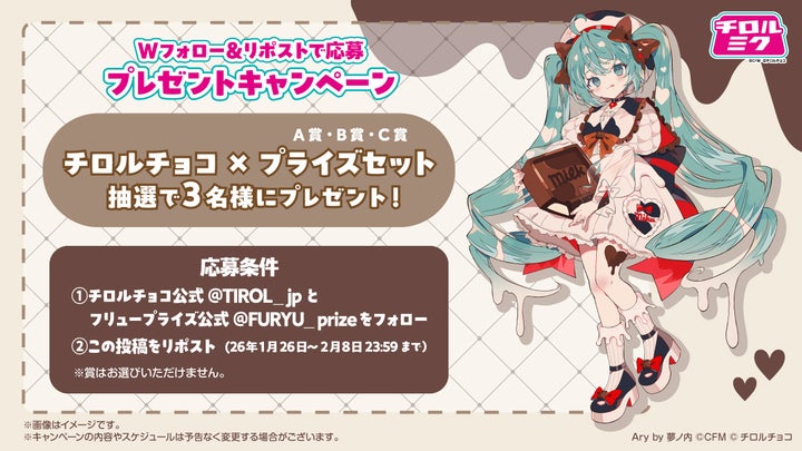 フリューは、初音ミクとチロルチョコのコラボ「チロルミク」を記念したアミューズメント専用景品を2月上旬より順次展開します。夢ノ内氏描き下ろしイラストの全6アイテムが登場し、SNSキャンペーンやインスタライブも実施します。