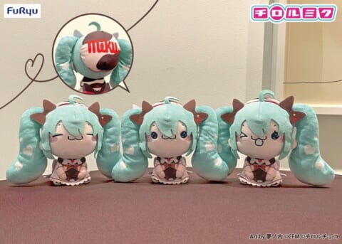 フリューオリジナルのデフォルメぬいぐるみシリーズ『もちぴこ』に登場します。チロルチョコを手にしたラブリーなミクに癒されるアイテムです。 |