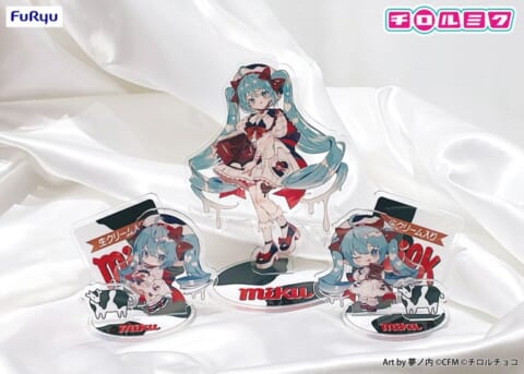 チロルチョコをイメージした個性豊かなデザインのアクリルスタンドもラインナップします。甘くて可愛いチロルミクの世界観をコンプリートできます。 |