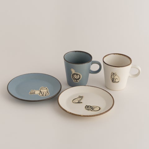 益子焼で制作したカップとプレートのセットです。マットな釉薬の質感と、スケッチねこの部分に施された撥水加工が特徴です。プレートはソーサーとしても活用できます。