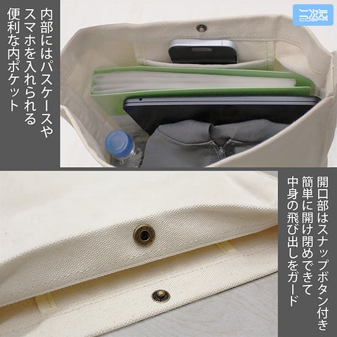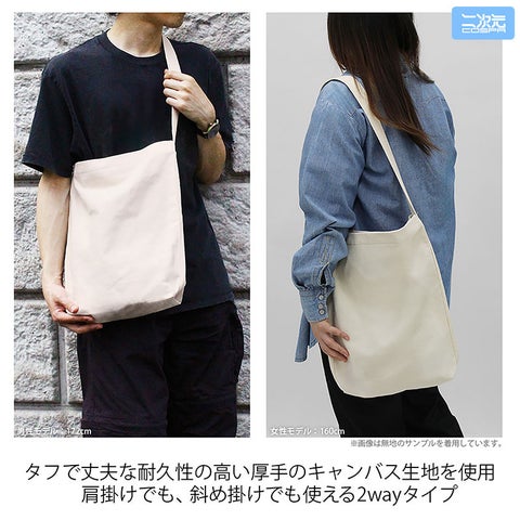 耐久性の高い厚手のキャンバス生地を使用したショルダータイプのトートバッグです。長めのベルトは斜めがけにも対応し、開口部にはスナップボタン、内部にはパスケースや携帯電話を入れられる便利な内ポケットを装備しています。イベントやお買い物でのサブバッグとしても活躍します。