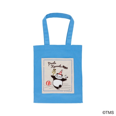 鮮やかなブルーの生地に、パパンダ、パンちゃん、トラちゃんがデザインされた大きめなポケット付きトートバッグです。刺しゅうされた英語の作品名には汽車が隠れており、パパンダはもこもことした触り心地のサガラ刺しゅうで表現されています。マチ付きでA4サイズの書類やクリアファイルも入り、外側と内側にもポケットが付いているため、通学やお出かけに最適です。
