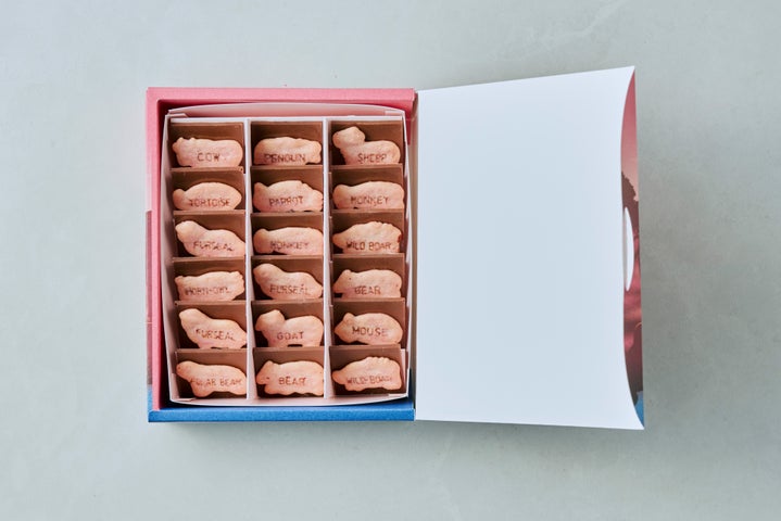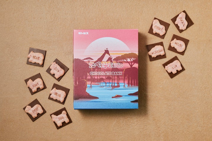 パッケージデザインもこだわりの一つです。CHOCOLATE BANKの2026コレクションコンセプトである「SAFARI」の世界観を詰め込んだ限定仕様です。ナイトサファリの世界観を描いた、少し大人な動物たちの中に、「たべっ子どうぶつ」の愛らしいキャラクターたちが登場しています。