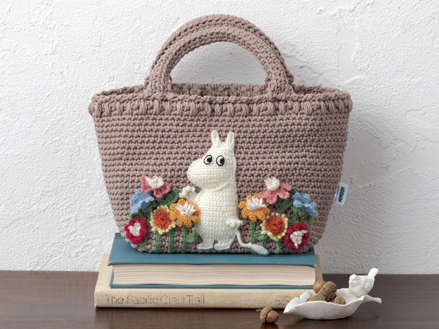 細編みがメインのトートバッグの側面には、ムーミンとフラワーモチーフのアップリケを施します。ムーミン部分にはわたを詰めて立体感を出し、バッグに深みのあるデザインを加えます。編み地がゆるまないようにきつめに編み上げることが、美しい仕上がりのポイントです。こちらのキットにもネームタグがついており、自分だけのオリジナルバッグを持つ喜びを体験できます。