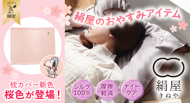 おかいものSNOOPY限定の『絹屋 シルク枕カバー』に新色の桜色が登場します。保湿性のあるシルク素材が肌と髪に潤いを与え、摩擦を防ぐ人気のナイトケア商品です。