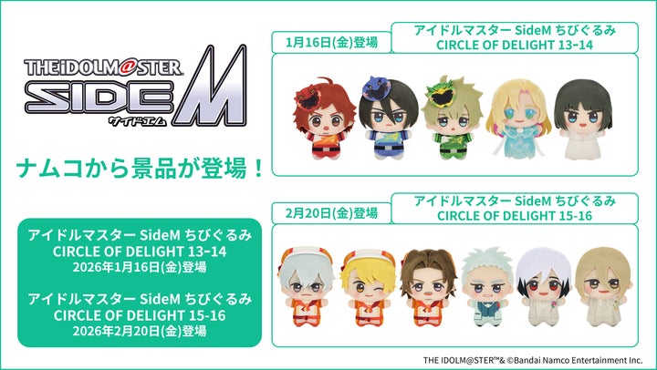 『アイドルマスター SideM』の「CIRCLE OF DELIGHT」楽曲衣装をまとったちびぐるみ景品が、2026年1月16日(金)より全国のナムコのアミューズメント施設およびナムコオンラインクレーンにて順次展開します。