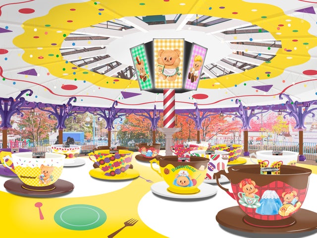 長年親しまれてきたアトラクション「ティーカップ」が、コラボレーションに合わせて「Par-tea CUP(パーティーカップ)」として大幅にリニューアルします。コンセプトは「ゲストと一体となって楽しめる“ライブ感”」です。音響・照明・映像設備を刷新し、中央に新設された大型LEDモニターにはButterbearの映像が流れ、カラフルでキュートな装飾とともにSNS映えする空間を演出します。アトラクション乗車中の動画撮影も可能であり、まるでButterbearと一緒にパーティーを楽しんでいるかのような特別な体験を提供します。
