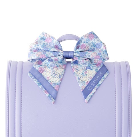 グリローズの定番アイテムとして、ランドセル購入者の約5割が購入するほど人気の「ランドセルリボン」にも新柄が登場します。既存の2種類に加え、ペルルとボンボンを柄のなかに散りばめた「ランドセルリボン リトルフレンズ」が、アイボリーとブルーの2色で展開されます。いろいろなお花と一緒にキャラクターが描かれており、暗い所で光が当たるとオーロラカラーに輝くチョウの絵柄の反射材も付いています。