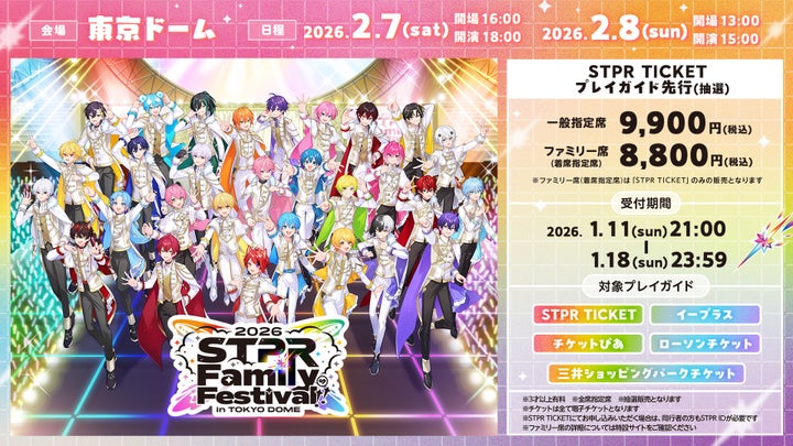 株式会社STPRは、所属する5グループが出演する大型ライブイベント「STPR Family Festival!! 2026」のSTPR TICKET・プレイガイド先行受付を2026年1月11日に開始しました。2月7日、8日に東京ドームで開催する本公演のチケット情報をお伝えします。