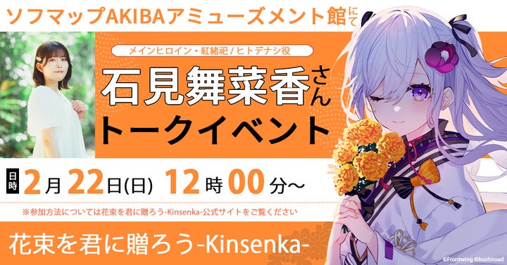 2026年2月22日には、ソフマップAKIBA アミューズメント館 8階にて、『花束を君に贈ろう-Kinsenka-』のパッケージ化を記念した石見舞菜香さんのトークイベントが開催されます。紅緒祀 / ヒトデナシ役を務める石見舞菜香さんが登場する、本作初のリアルイベントです。Nintendo Switch™またはPCパッケージ版(初回限定版を含む)を予約された方の中から抽選でご招待します。応募方法の詳細は公式サイトニュースにてご確認ください。