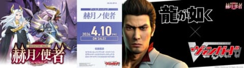 ブースターパック「赫月ノ使者」が4月10日(金)に発売決定しました。TVアニメ「カードファイト!!ヴァンガード Divinez 幻真星戦編」でガブエリウス(幻影)が使用する『魔王竜 ガブエリウス”幻影”』が収録されます。また、龍が如くシリーズとのコラボレーションも決定しており、主人公の桐生一馬をはじめ、「龍が如く極」「龍が如く極2」「龍が如く 極3 / 龍が如く3外伝 Dark Ties」に登場するキャラクターたちがカード化されます。コラボレーションバージョンのTVCMも現在制作を進めています。